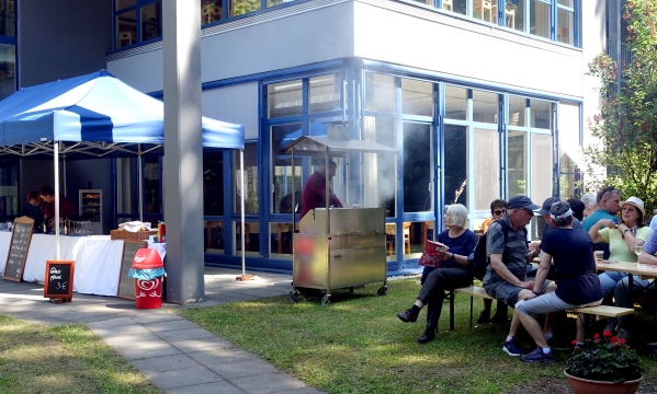 1. Station: Sophienklinik (Nr.5). Wir haben Wein und Glockenspiel im Schatten genossen und einen Rundgang